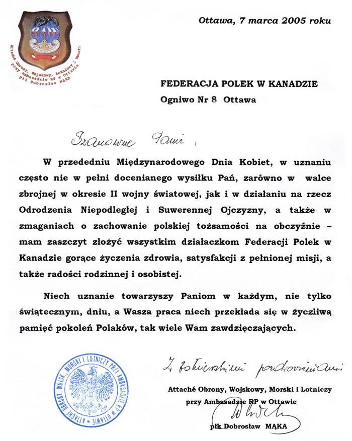 On the occasion Ladies from PCF received a congratulation letter from Mrs. Teresa Berezowski, the President of the Canadian Polish Congress.
