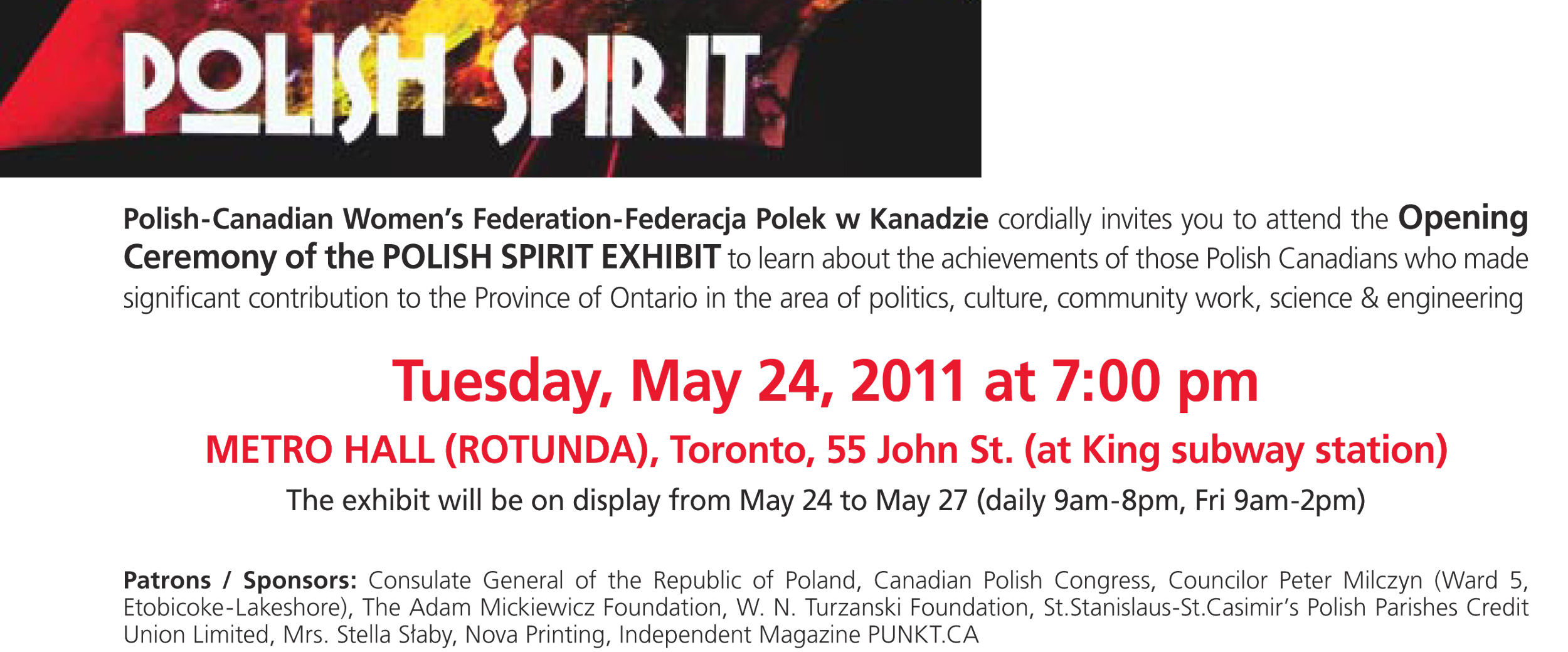 The Polish Spirit Exhibit opens to the public on May 24th, 2011 at 7:00 pm at the Metro Hall (Rotunda).